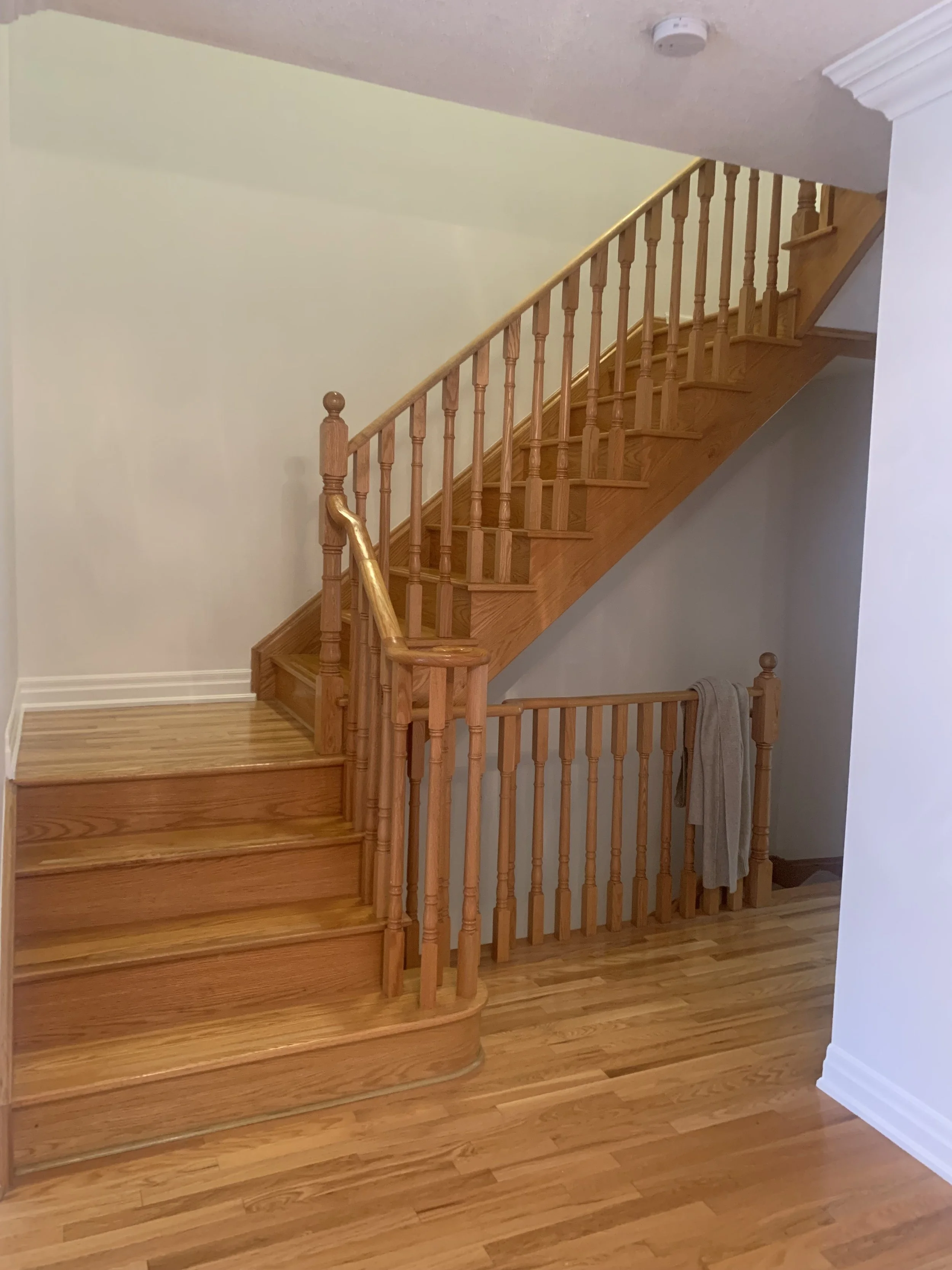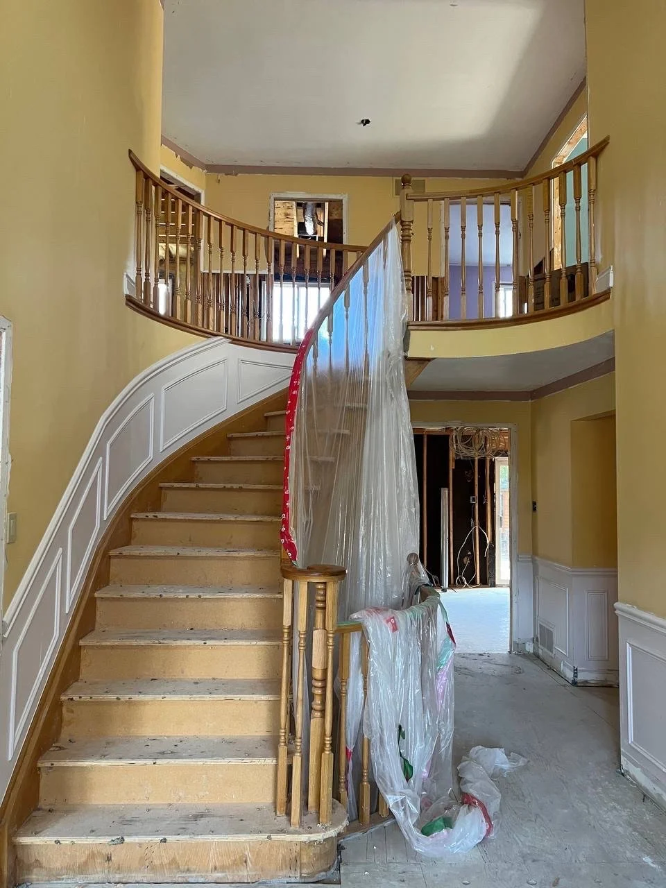 Which brings me to the staircase. Yes, the picket and rails. You know them. They are often in an oak finish with an orangey yellow color. Sounds familiar? And lest we forget the Scarlett O'Hara staircase which divides the home in half and makes a splendid bridal moment but can look dated over time.